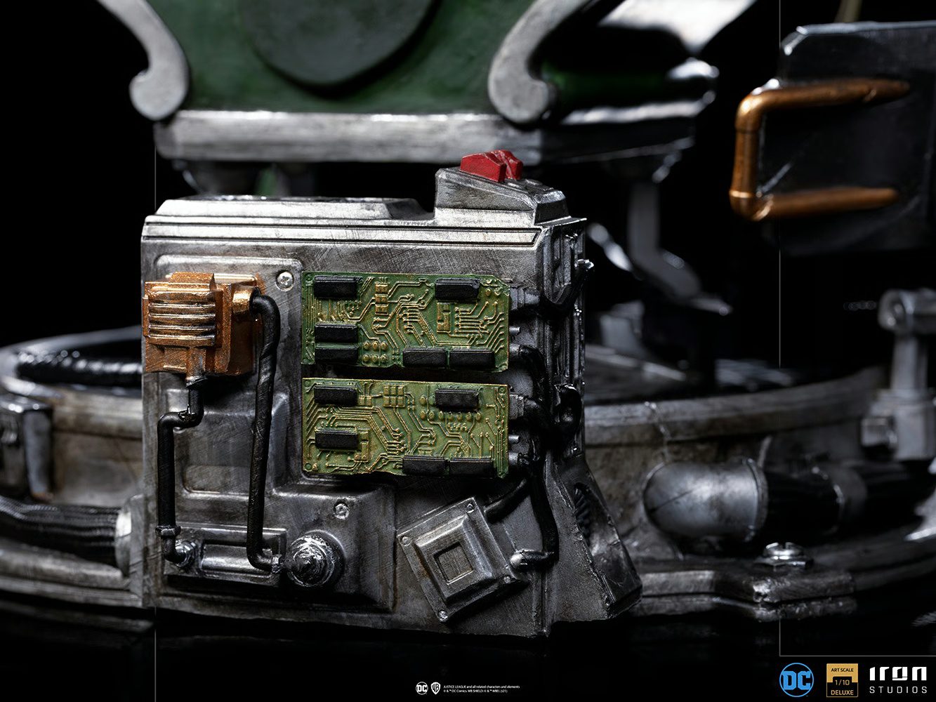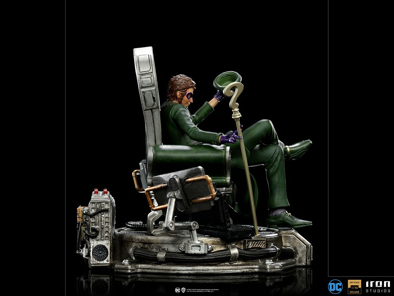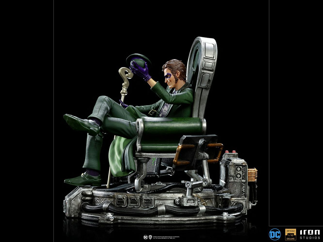 Surrounded by monitors and tech equipment in his lair, the always enigmatic figure of a criminal genius, dressed in his green suit with an overcoat full of question marks, with a purple tie, vest, gloves, and mask, relaxes on his throne as he expresses respect to his greatest opponents. He holds his bowler hat in his left hand and balances his question mark-shaped cane between the fingers of his right hand, an artifact that has a wide variety of technological devices and weapons. Without any mystery, Iron Studios unveils its statue â€The Riddler Deluxe – DC Comics Series #7 – Art Scale 1:10â€, featuring one of Batman’s most classic and iconic enemy villains.