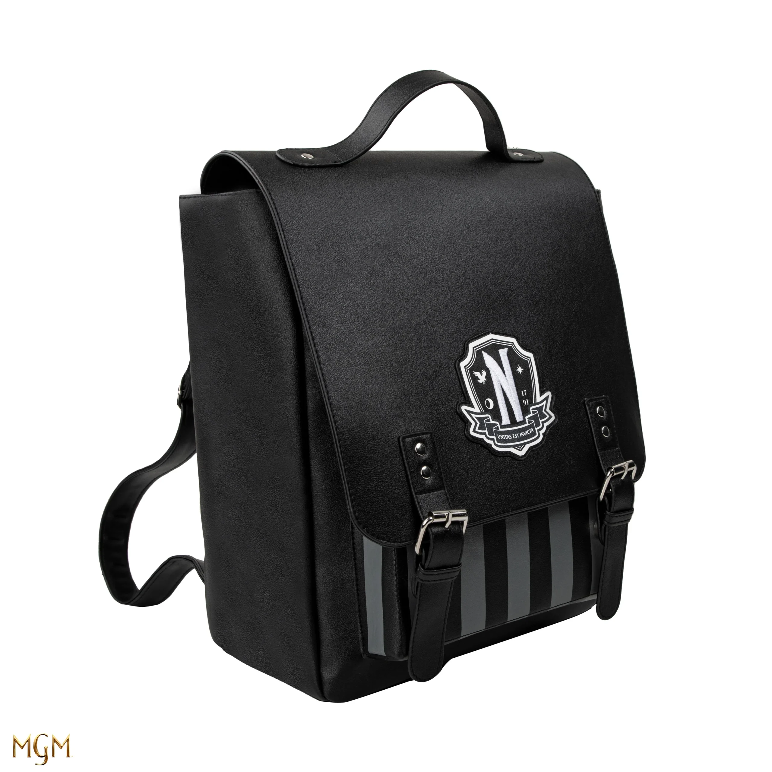 The iconic Nevermore Academy school logo takes centre place, but instead of the classic purple and yellow design, this logo is black and grey. Meanwhile, the bottom half of the backpack is adorned with black and grey stripes.