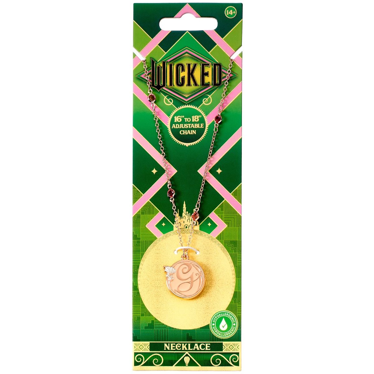 Be inspired by the radiant beauty of Glinda with this mesmerising Wicked Glinda rose gold tone necklace. The chain is adorned with shimmering crystals and Glinda’s iconic initial ‘G’, pendant. This necklace captures the essence of Glindas female empowerment. The chain is adjustable between 40cm and 45cm, making it suitable for ages 14+. Add this officially licensed piece to your jewellery collection and channel your inner goodness.