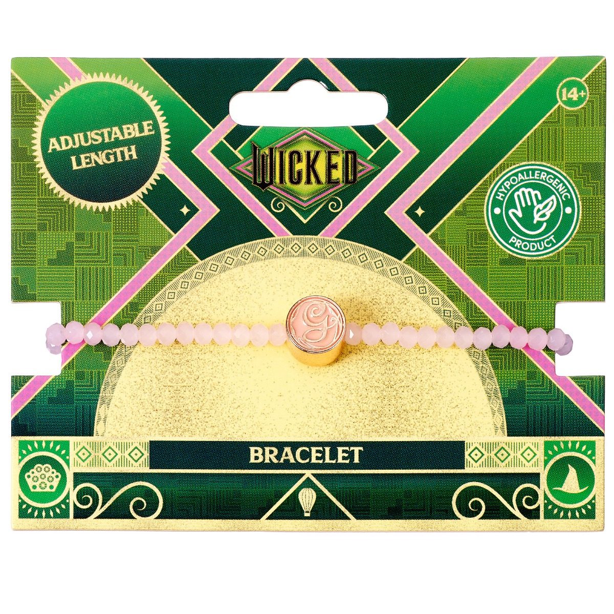 Experience the magic of goodness and kindness with the delicate and beautiful Wicked Glinda Rose Quartz Bead Bracelet. This friendship style accessory with adjustable cord features an initial ‘G’ bead and measures 15cm at its smallest. Inspired by the iconic pink gown and magical powers of Glinda, this bracelet is perfect for ages 14 and up. From an officially licensed collection of stunning jewellery.